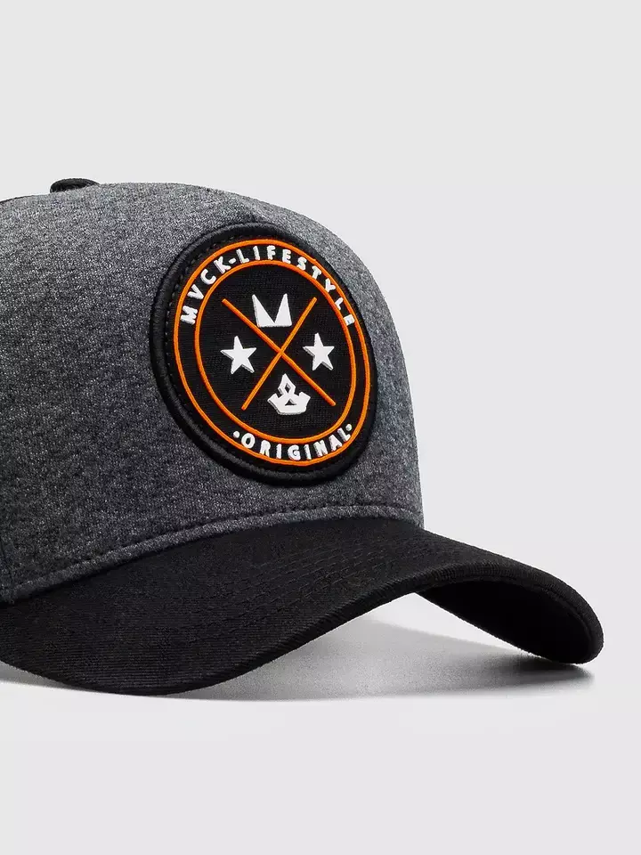 Boné Trucker Brasão Mescla MVCK, confeccionado em tecido algodão na aba, moletom na testa e poliéster na tela.