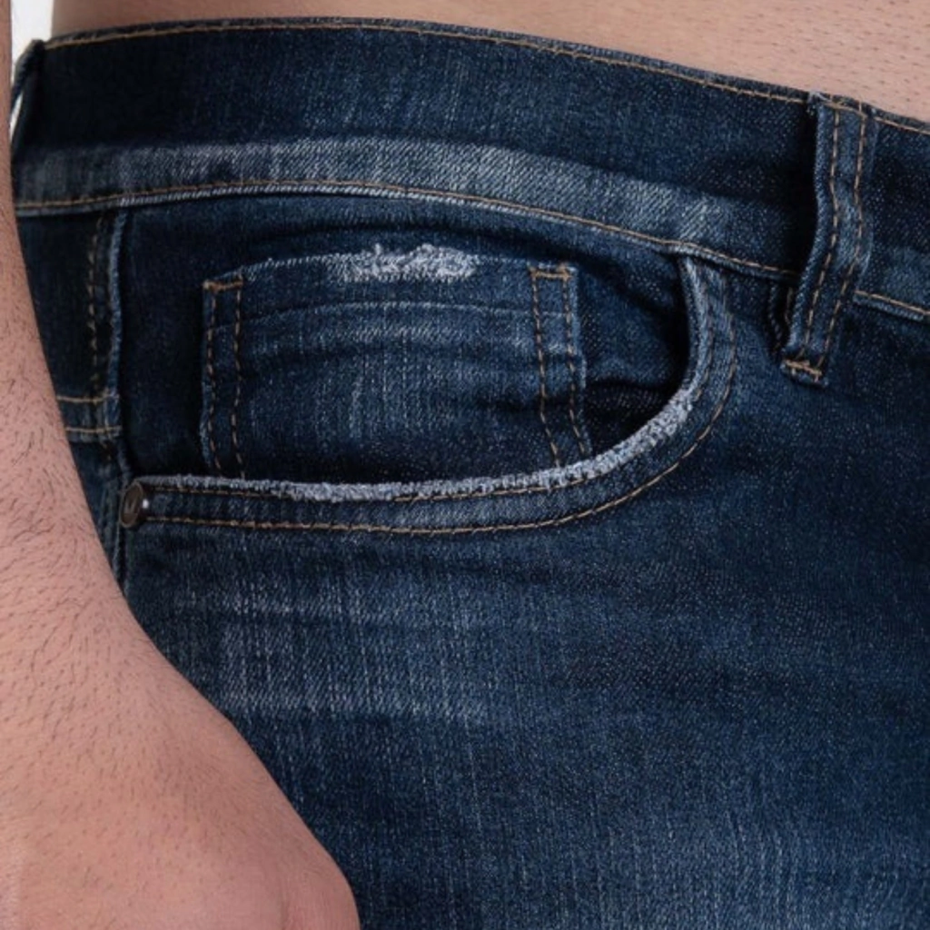 Beneficiamento Exclusivo: Apresenta lavagem Stone escuro com marcações e USED suave, contando com puídos leves no cós dos bolsos.