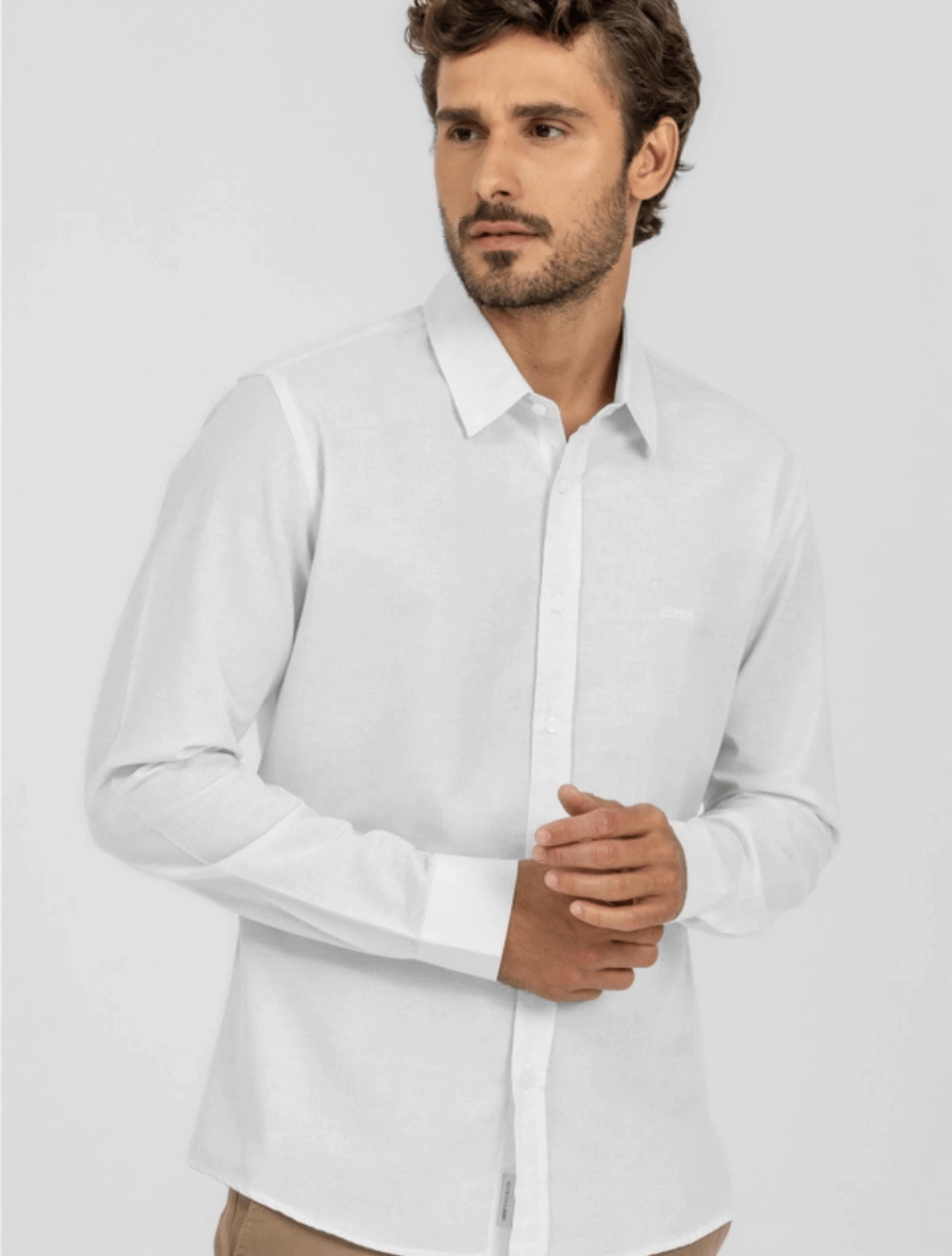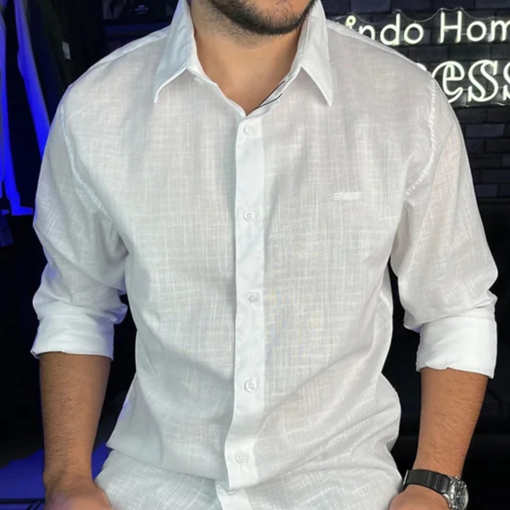 Com a modelagem Slim, a camisa oferece um caimento moderno e ajustado ao corpo que valoriza a silhueta masculina. Feita em 100% Algodão, possui um aspecto rústico que lembra a textura nobre do linho, garantindo leveza, alta respirabilidade e um toque sofisticado.