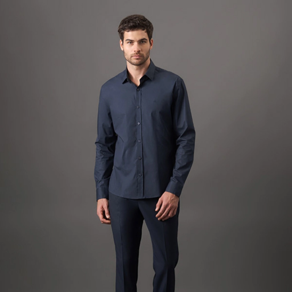 Para um visual formal impecável, combine esta camisa com uma calça de alfaiataria e sapatos sociais. Se a ocasião permitir um toque mais casual, opte por jeans escuros e mocassins, equilibrando elegância e descontração.