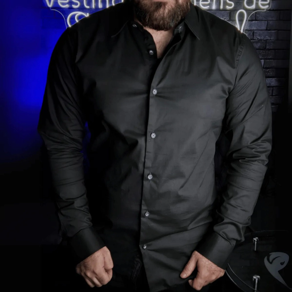 Camisa social masculina Preta slim é o tipo de peça que precisa fazer parte do seu guarda-roupa. Sua modelagem conta com colarinho francês e fechamento por sete botões.