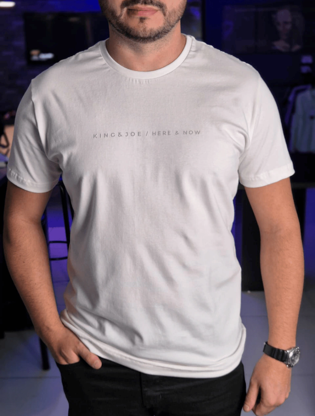 Design Minimalista: O destaque é a estampa centralizada com a escrita "KING & JOE / HERE & NOW" aplicada=. O design sutil e sofisticado agrega valor à peça sem perder a versatilidade.