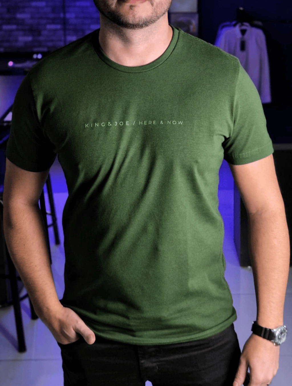 Design Minimalista: O destaque é a estampa centralizada com a escrita "KING & JOE / HERE & NOW" aplicada=. O design sutil e sofisticado agrega valor à peça sem perder a versatilidade.