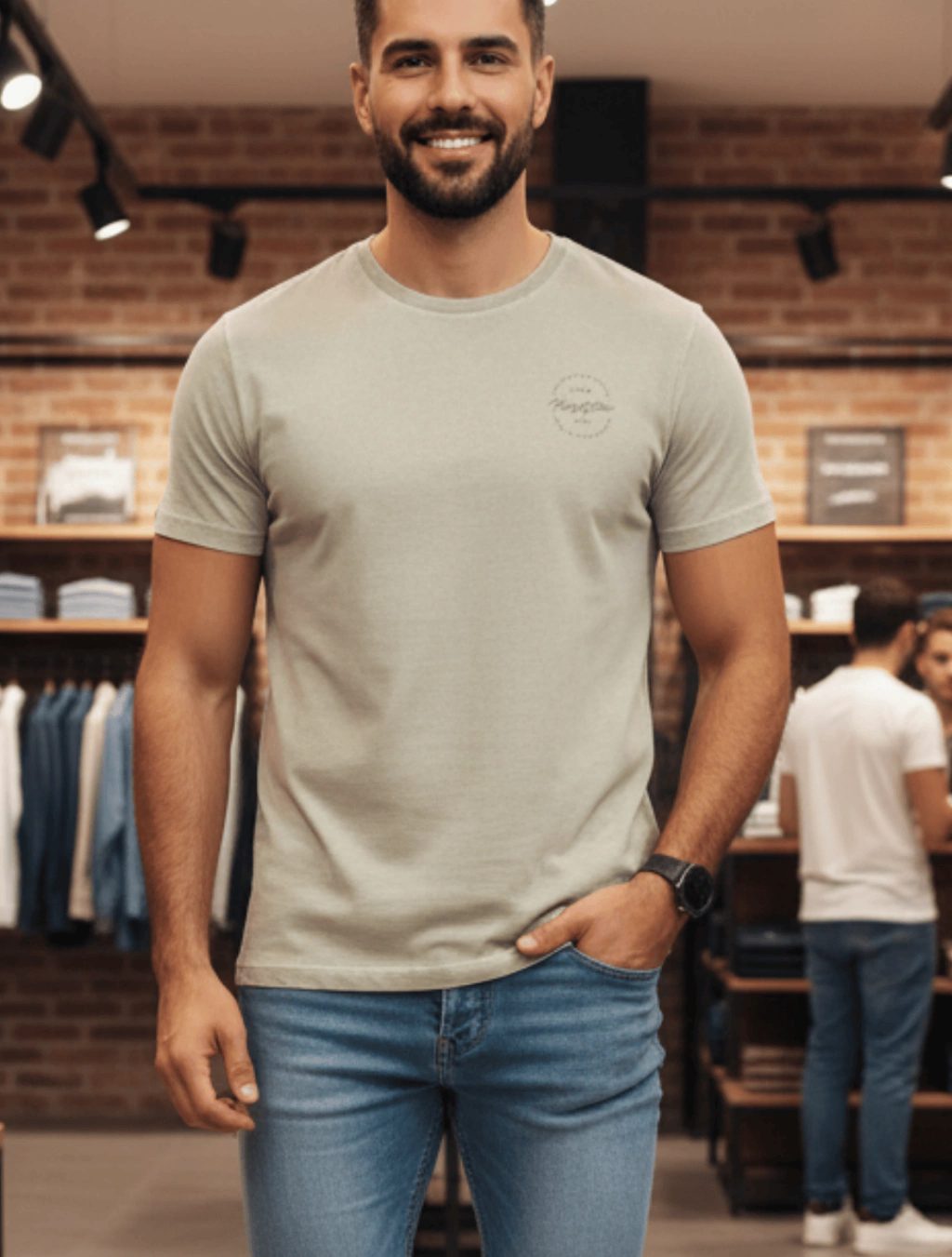 Camiseta confeccionada em malha fio 30, com processo de tingimento estonado, que é feito através de uma tintura superficial com a cor da malha, depois passa por um processo de abrasão suave que consiste em tingir e desgastar proporcionando marcações em diferentes regiões da peça. O aspecto desgastado fica mais intenso nas regiões de costura, o que deixa a camiseta única, pois cada peça sempre reage a esse processo de forma diferente.