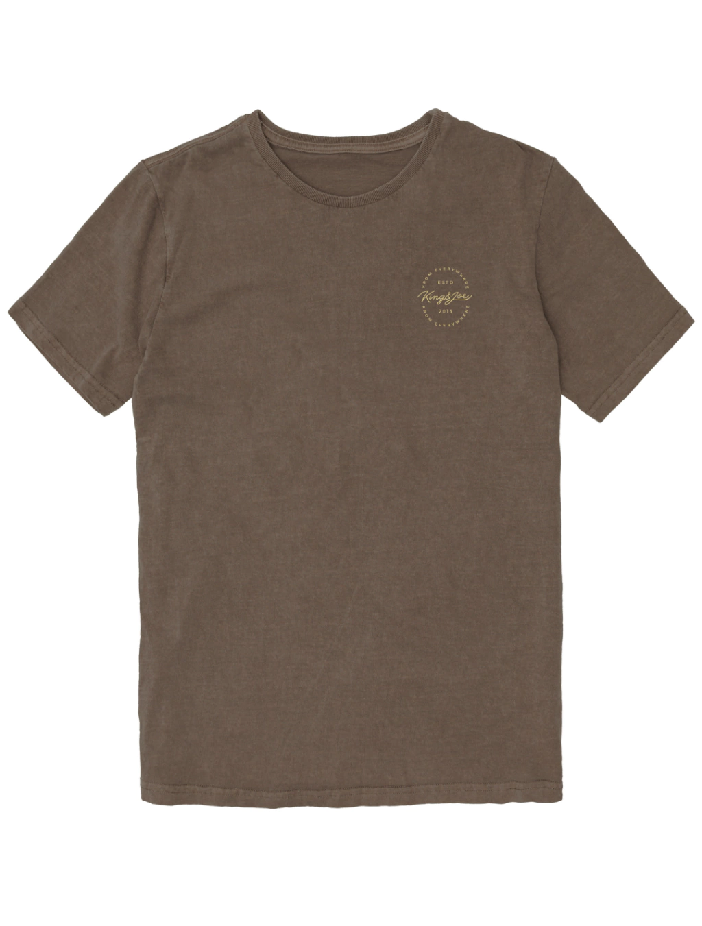 Camiseta confeccionada em malha fio 30, com processo de tingimento estonado, que é feito através de uma tintura superficial com a cor da malha, depois passa por um processo de abrasão suave que consiste em tingir e desgastar proporcionando marcações em diferentes regiões da peça. O aspecto desgastado fica mais intenso nas regiões de costura, o que deixa a camiseta única, pois cada peça sempre reage a esse processo de forma diferente.