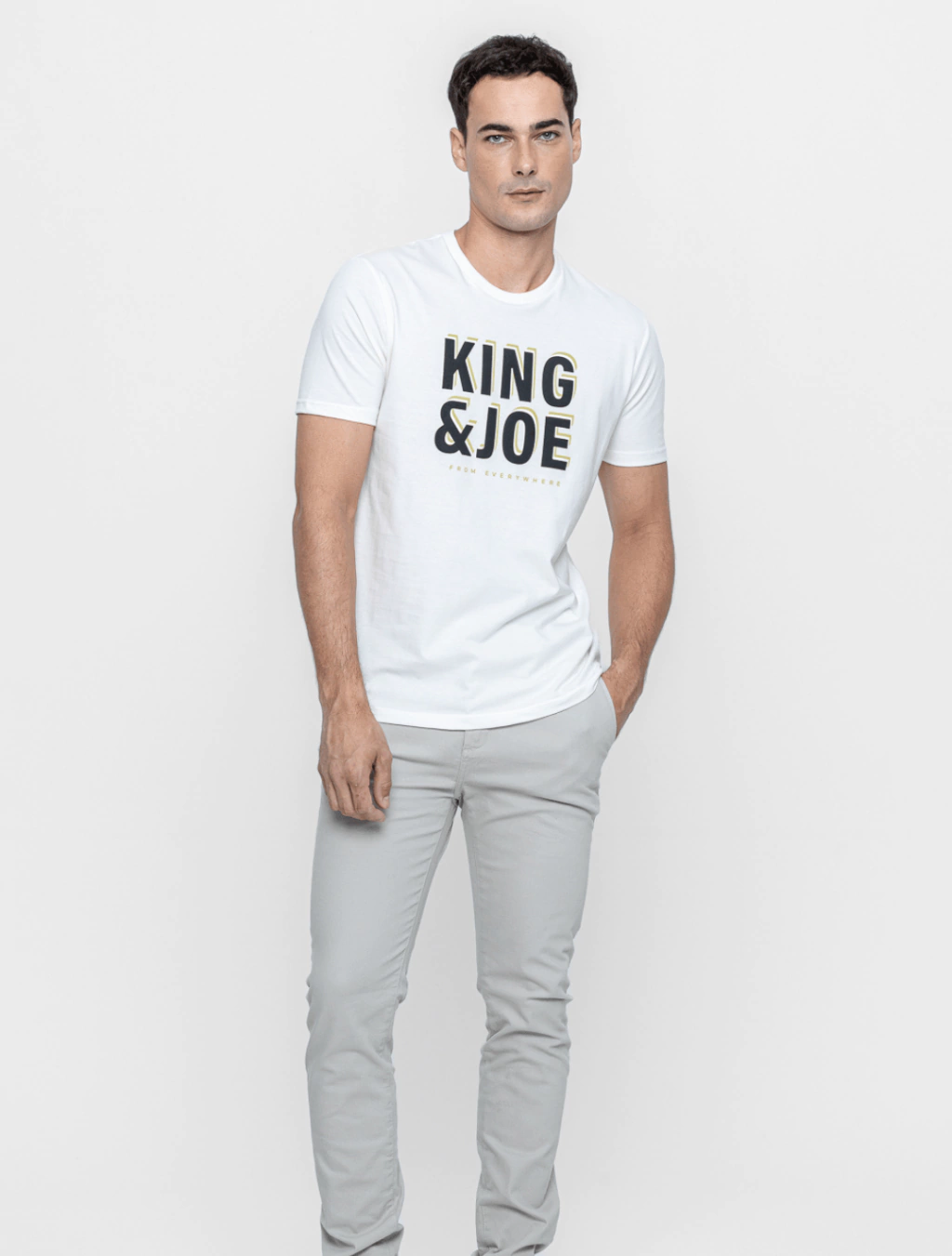 Apresenta a estampa frontal "KING & JOE" com tipografia impactante em tom escuro (preto/chumbo) com detalhes de sombreamento em dourado/bege, criando um efeito visual moderno e tridimensional.