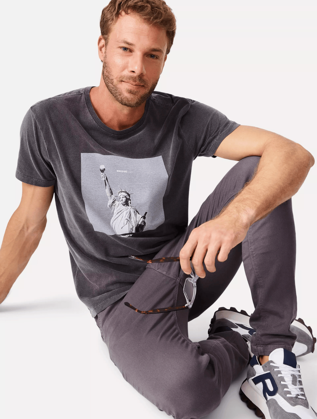Confeccionada em 100% algodão, a camiseta possui um toque macio e o visual moderno do preto estonado. O processo de estonagem confere um charme único e um aspecto levemente desgastado, garantindo uma peça cheia de personalidade.