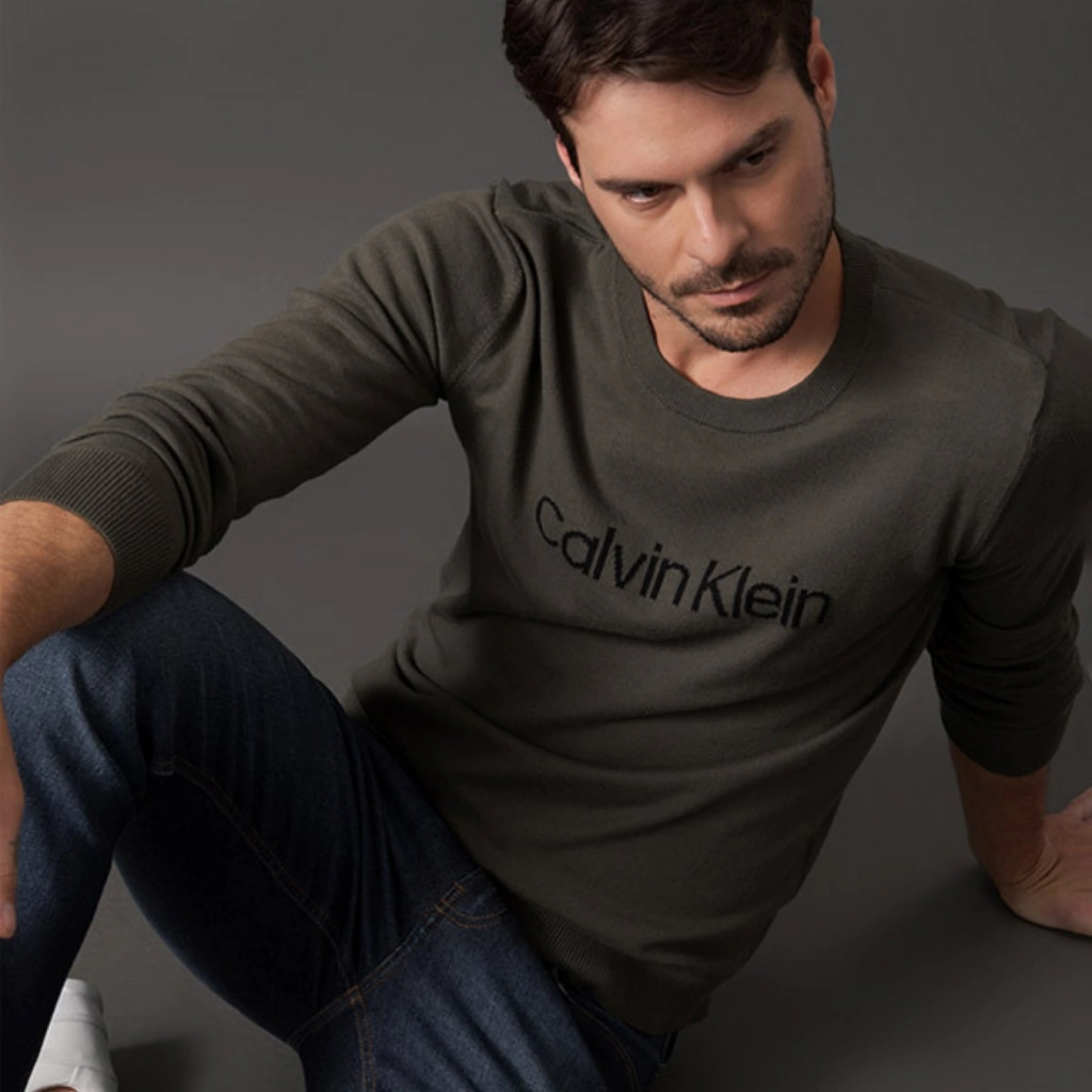 A modelagem do suéter proporciona um caimento perfeito, valorizando a silhueta masculina. O design clássico é complementado pela sutil logo da Calvin Klein, que adiciona um toque de autenticidade e classe à peça.